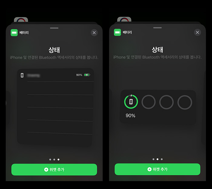 이건 배터리 2번째 위젯 디자인과 3번째 위젯 디자인입니다. 리스트 형태의 위젯도 있으며 가로 아이콘 형태의 위젯도 있으니 자신의 취향에 맞게 디자인을 고릅니다. 아마 오른쪽의 가로형태의 배터리 위젯이 가장 많이 사용되지 않을까 그런 생각이드네요. 에어팟이나 워치 종류가 있다면 아이폰 모양의 위젯 옆에 워치와 에어팟 모양의 배터리 퍼센트 표시가 같이 나타납니다.