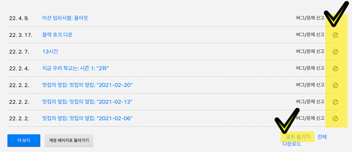 이제 자신의 넷플 시청 기록이 년,월,일 순서로 출력됩니다. 하나씩 숨기고 싶다면 삭제하고 싶은 콘텐츠의 이름 오른쪽에 있는 금지마크를 누르면 개별로 삭제가됩니다. 만약 한꺼번에 모든 시청 기록을 삭제하는 경우라면 하단에 위치한 "모두 숨기기" 버튼을 선택하세요.