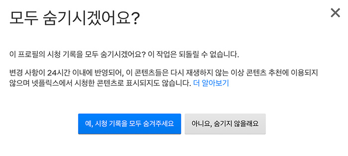 예, 시청 기록을 모두 숨겨주세요.를 선택하면 더이상 넷플릭스 앱이나 계정의 프로필에서 시청했던 콘텐츠들의 목록이 출력되지 않습니다.