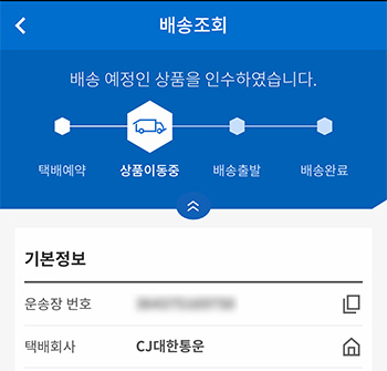 CU 편의점에서 접수했던 택배물품을 수거했다는 문자 메세지를 받고 송장 CJ 택배 앱에서 조회하니 수거 완료하고 상품이 이동하고 있음을 확인할 수 있었습니다.