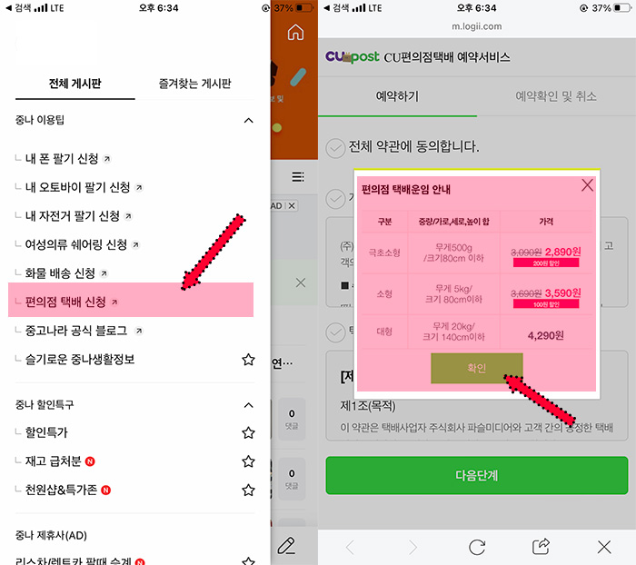 중고나라 카페에서 "편의점 택배 신청"을 이용하면 택배비 운임 안내가 판업으로 나타납니다.(위 오른쪽 이미지)