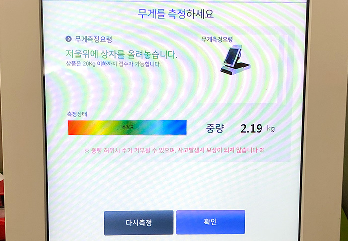 기기에 택배박스를 올려 무게를 측정합니다. 저는 "소형" 택배로 500g 이상 5Kg 이하의 무게만 나오면 접수가 가능합니다. 기기에서 측정한 무게는 2.19Kg으로 접수가 가능한 수치입니다.