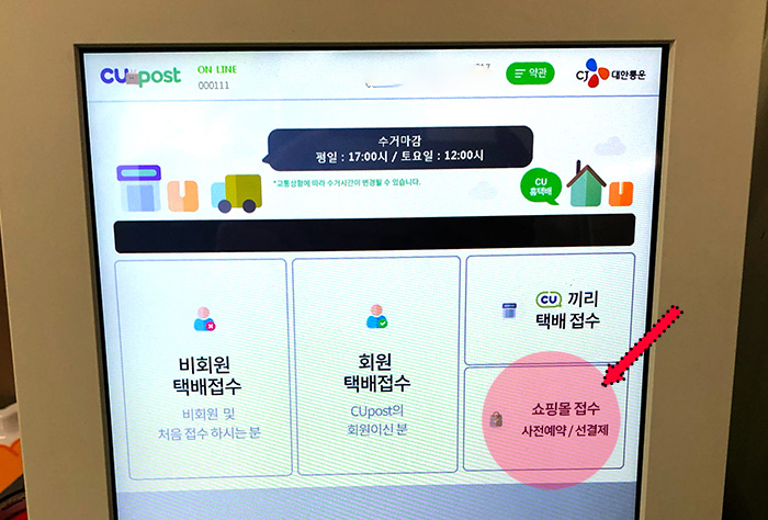 CU post 기기에서 "쇼핑몰 접수 - 사전예약/선결제" 버튼을 선택