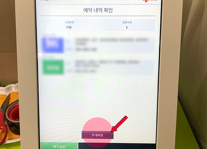 모바일이나 PC상에서 예약했던 내용을 확인합니다. 보내는 사람의 전화와 주소 그리고 받는 사람의 전화번호 주소지를 체크해서 이상이 없으면 아래의 "무게측정"을 눌러 배송하려는 택배의 무게를 측정합니다.