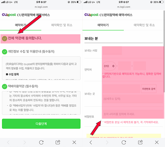 약관에 동의하고 보내고 받는 사람의 인적사항 (전화번호, 주소)를 입력합니다. "비밀번호"는 예약조회에 사용되는 숫자 4자리로 기억하는게 좋습니다. 비밀번호 분실 시 예약조회가 불가합니다.