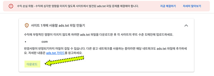 "수익 손실 위험 - 수익에 심각한 영향을 미치지 않도록 사이트에서 발견된 ads.txt 파일 문제를 해결해야 합니다."