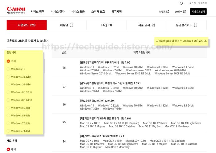 아니면 운영체제는 "전체"로 체크하고 그 밑에 자료 유형은 "드라이버"를 선택하면 윈도우와 MacOS 드라이버 설치 파일 목록이 모두 나타납니다.